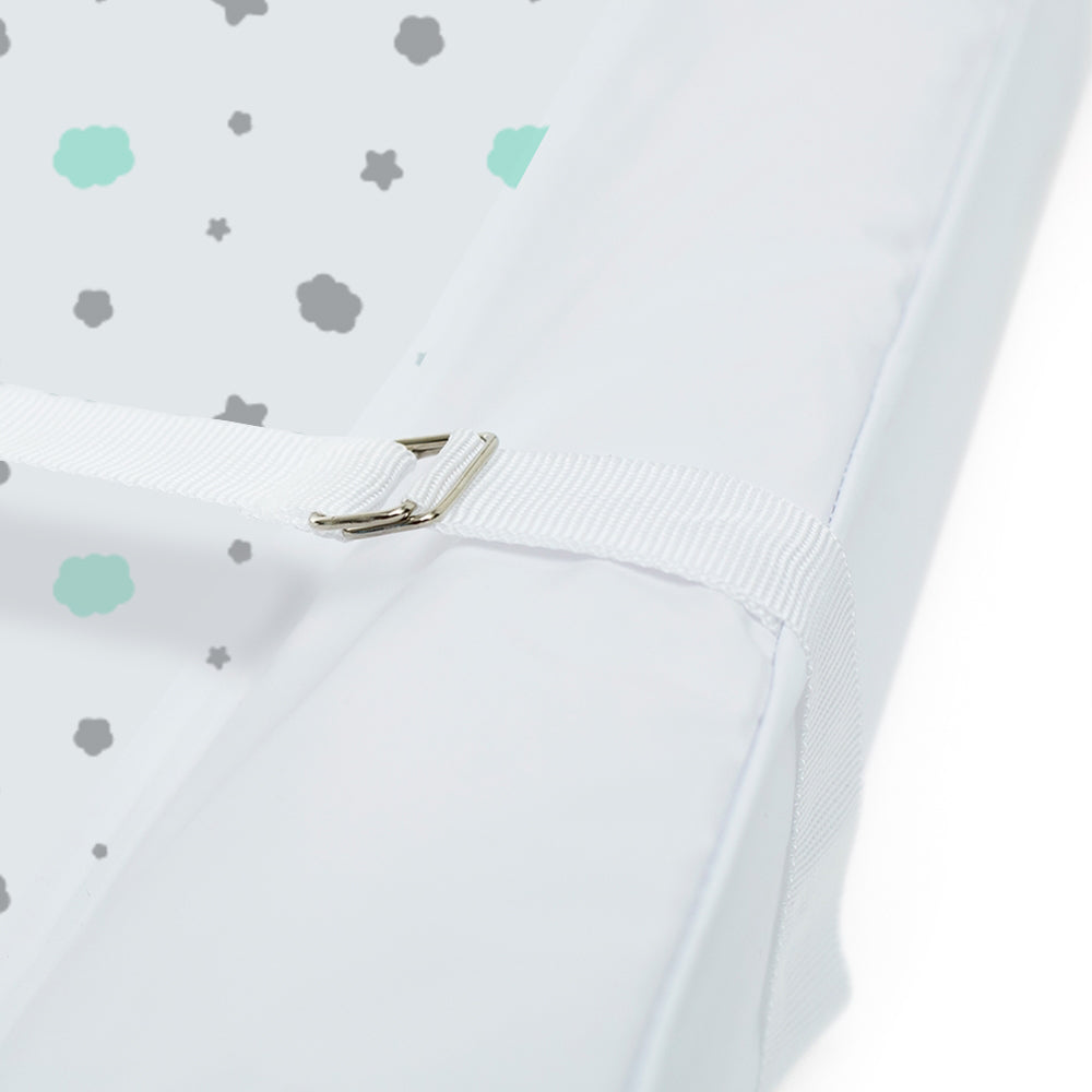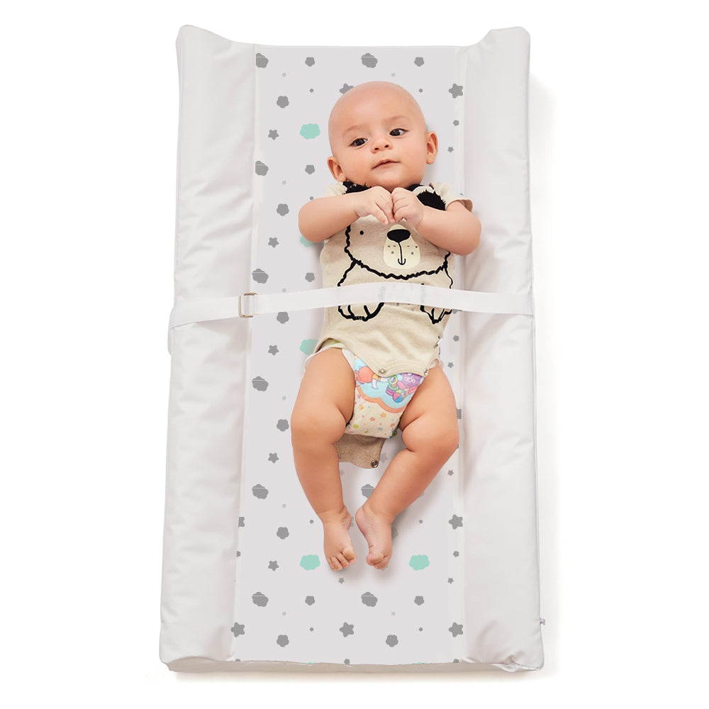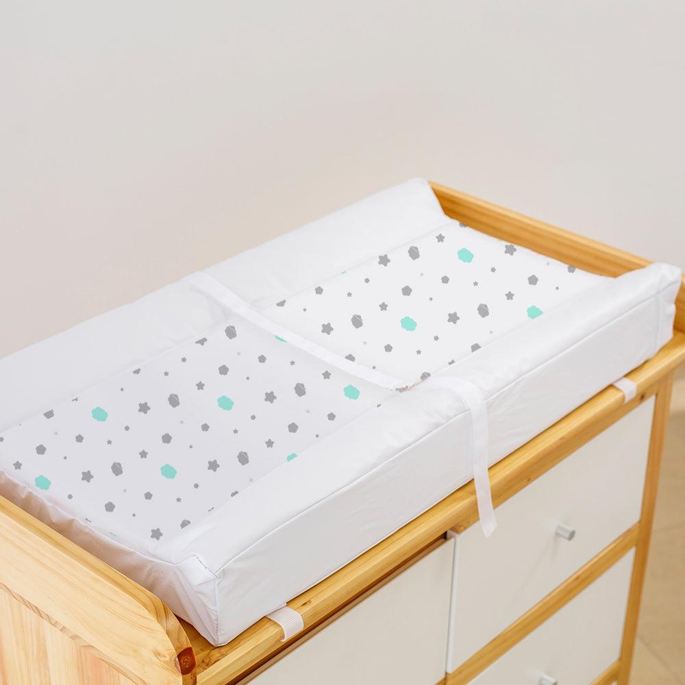 Colchón cambiador para mueble, con correas de seguridad que se ajustan al mueble cambiador del bebé, en espuma firme y forro antifluido removible.